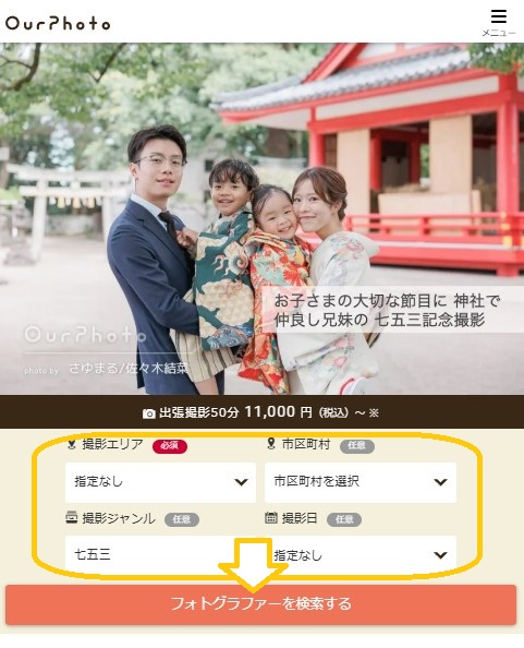 公式サイトで七五三の参拝日時を入力し、「七五三」ジャンルを選んで、撮影可能なカメラマンを探します。